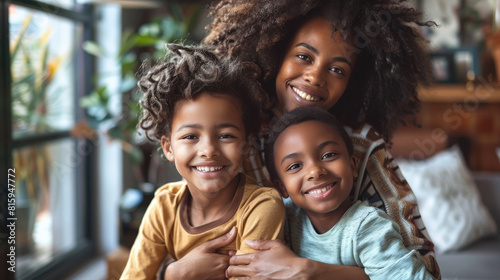 A single mother sharing moments of happiness with her children in their apartment, realistic photography,minimalist background, clean and simple setting, free space