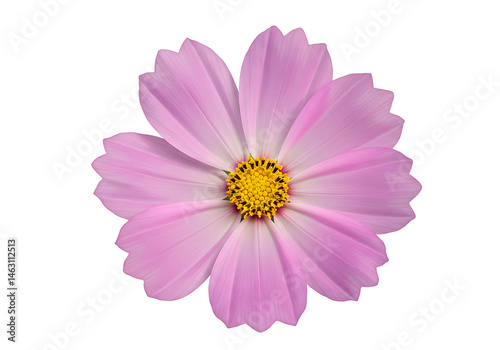 A single pink cosmos flower with a yellow center isolated on a white background in full bloom view