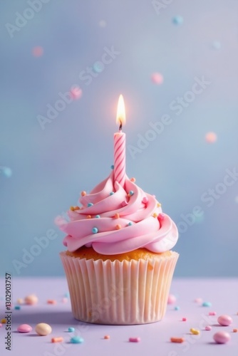 cupcake, candle, birthday, dessert, sweet, pink, frosting, sprinkle, celebration, party, delicious, treat, sugary, confectionery, baked, pastry, food, light, pastel