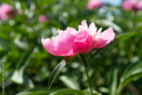 A single pink peony on blurred green leaves background at the sunny day, side view. Bright congratulation on the holiday. Flower bud. Peony bud for poster, calendar, post, screensaver, wallpaper, card