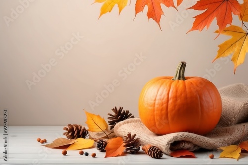pumpkin, leaf, pine cone, table, autumn, fall, harvest, orange, brown, white, background, beige, wood, yellow, red, green, decoration, season, nature, still, life, arrangement, decor, rustic, cosy, tabletop, single, lone, solitary, soft, warm, colours, festive, holiday, natural, element, centrepiece, traditional