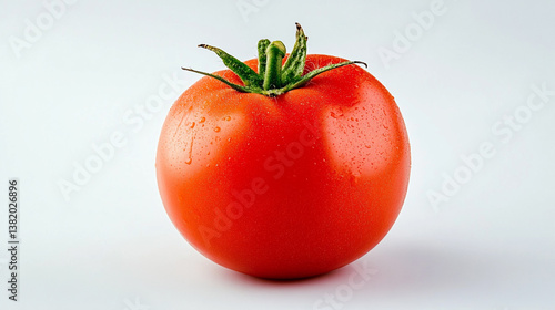 A single ripe red tomato with green stem and water droplets on a plain white background in close up view