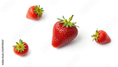 A single, ripe strawberry, perfectly isolated on a pure white background, clean, ripe