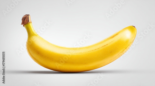 A single ripe yellow banana is lying on a plain white surface in studio lighting