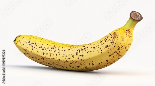 A single ripe yellow banana with brown spots on a white background. Generative ai