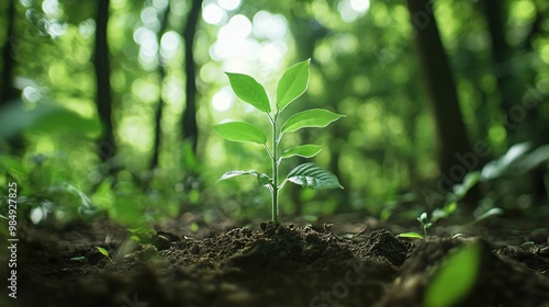 sapling, germ bud, tree, plant, forest, timberland, green, leaf, nature, growth, sunlight, sun, dappled, light, shade, brown, dirtied, dirt, ground, environment, life, germinating, stem, tree branch, foliage, new, fresh, young, small, delicate, vibrant, background, blurred, bokeh, outdoors, wild, wildflower, flora, botanical, ecology, organic, bio, vegetation