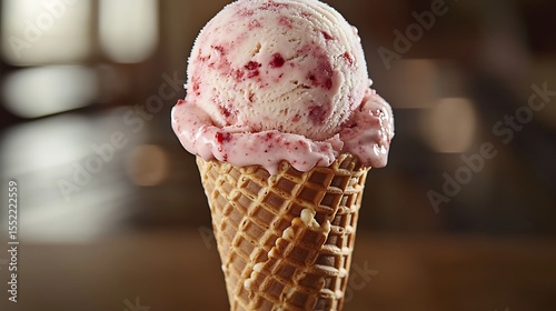 A Single Scoop of Strawberry Ice Cream a Waffle Cone Crisp Details Studio Lighting