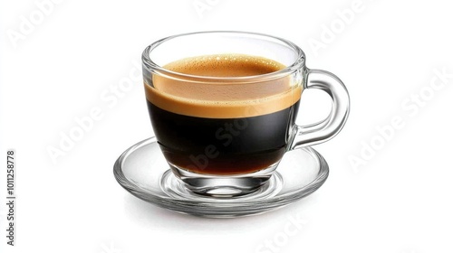 A single shot of rich espresso in a small glass cup, isolated on a bright white background, with a layer of crema on top, perfect for coffee-related themes.