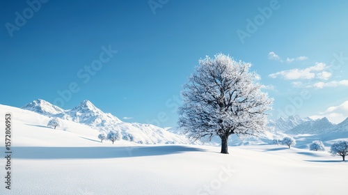 A single snow covered tree stands majestically in a pristine winter landscape against a backdrop of snow capped mountains under a bright blue sky a realistic photo perfect for