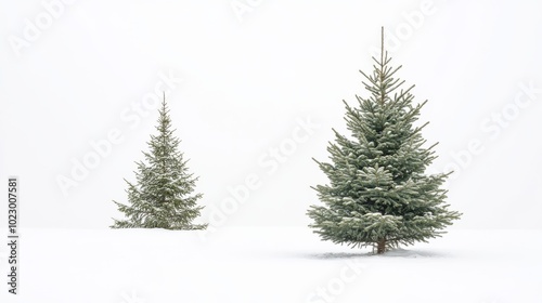 A single spruce tree stands out against a white backdrop. You can also see a fir, pine, and another spruce tree, all separate from the background. One of the spruce trees is shown from the side.