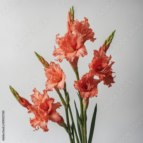 A single stem of gladiolus flowers in pink and coral tones on a white background.