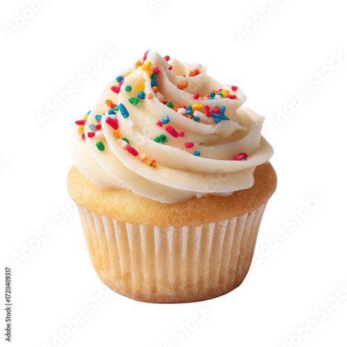 A single vanilla cupcake with creamy frosting and colorful sprinkles, isolated on a transparent background. background removed