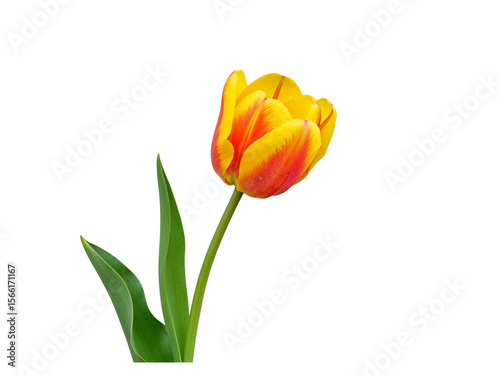 A single vibrant yellow and red striped tulip flower with green leaves isolated on transparent background