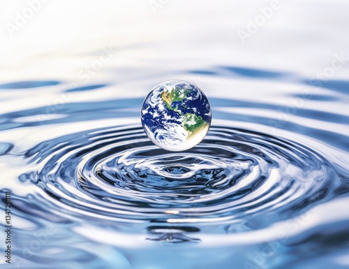 A single water droplet shaped like Earth floating above rippling water, symbolizing global conservation and sustainability. Ideal for World Water Day, environmental campaigns, and climate awareness