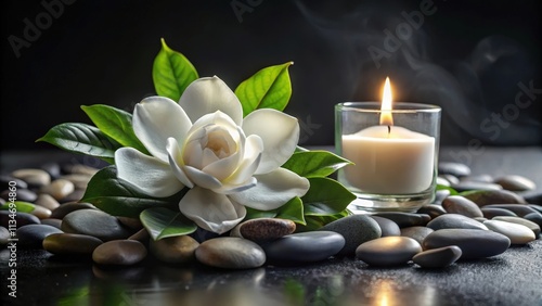 A Single White Flower and a Burning Candle Rest on a Bed of Smooth Stones