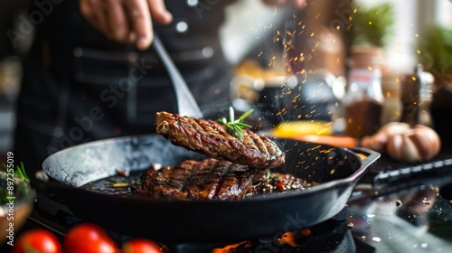 A sizzling steak being flipped on a cast iron skillet, with kitchen utensils and ingredients in the background.