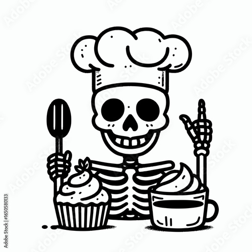 A Skeleton as pastry chef. Retro Vintage Line Art Clipart Silhouette Vector Illustration. .