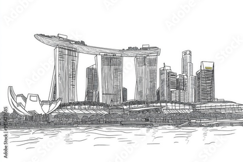 A sketch of a modern skyline featuring iconic buildings and waterfront.