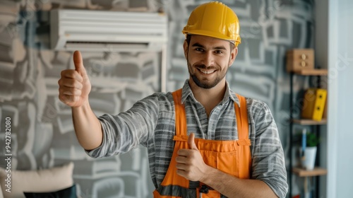 A skilled air conditioner repairman gives a thumbs up after repairing a broken air conditioner. in the office building