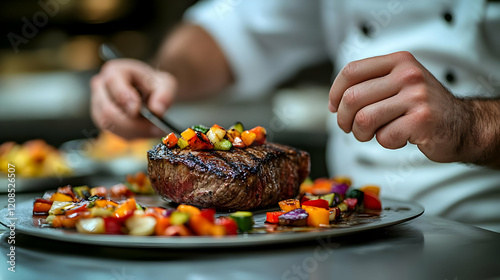 A skilled chef expertly prepares a succulent grilled steak, garnished with colorful sauteed vegetables, creating an exquisite culinary experience.