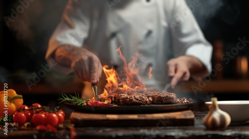 chef, cooking, steak, grill, flames, kitchen, dinner, preparation, searing, meat, vegetable, herb, culinary, fire, favor, epicure, food, professional, kitchen utensile, spatula, frying, aroma, hot, knife, presentation, fresh, vibrant, cookery, passion, delicious, service, skill, bar-b-q, smoky, art, plate, organic, healthy, meal, grilled, sauce, seasoning, eatery, tool, cook, chopping, board, technique