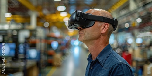 A skilled engineer with a VR headset is overseeing production in an industrial manufacturing facility.