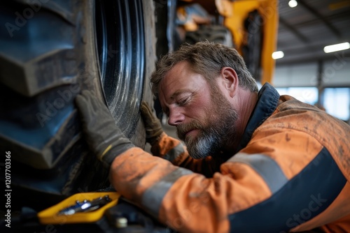 mechanic, tire, heavy, equipment, repair, workshop, craftsmanship, dedication, skill, maintenance, sharpened, man, industrial, labor, industry, hard work, machinery, determination, tool, mechanic, safety, strength, teamwork, perspiring, vehicle, power, expertise, performance, orange, glove, mud, tire, quality, closeup, engineering, effort, exhaustion, human