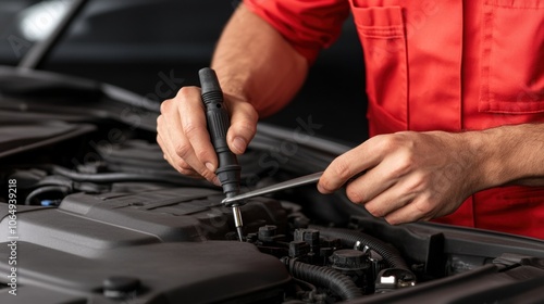 A skilled mechanic focuses intently while repairing an engine, using a wrench and screwdriver to adjust various components under the hood in a well-equipped garage setting