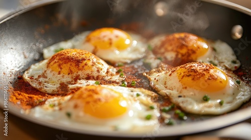 A skillet with fried eggs being seasoned with a pinch of curry powder and paprika, ready for a flavorful meal.