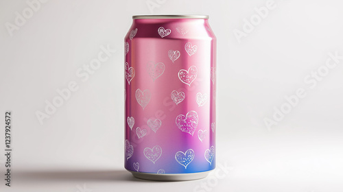 A sleek aluminum beverage can with pink color with hearts, isolated on a white background