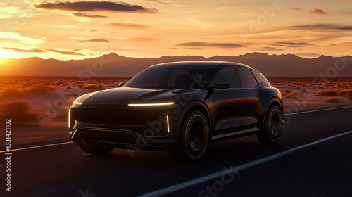 A sleek and modern SUV, captured in motion on an open road at sunset