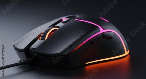 computer, mouse, gaming, technology, electronic, device, peripheral, cursor, input, equipment, digital, office, work, game, play, led, neon, light, glow, dark, background, modern, sleek, black, orange, pink, cable, scroll, wheel, buttons, ergonomic, design, professional, performance, speed, precision, control, wireless, wired, desktop, laptop, futuristic, high technology, studio
