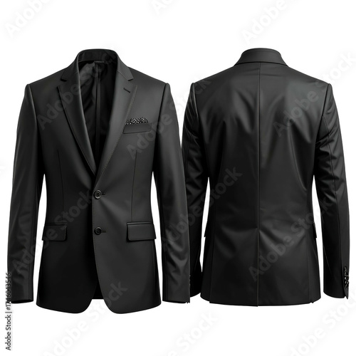 suit, black, jacket, formal, tailored, elegant, fashion, style, clothing, apparel, attire, modern, business, professional, front, back, view, single, buttons, pocket, collar, lapel, sleeve, shoulder, fabric, texture, smooth, clean, detail, design, structure, shape, silhouette, dark, classic, simple, monochrome, presentation, display, isolated, neutral, plain, gentleman, dress, precise, luxurious, refined