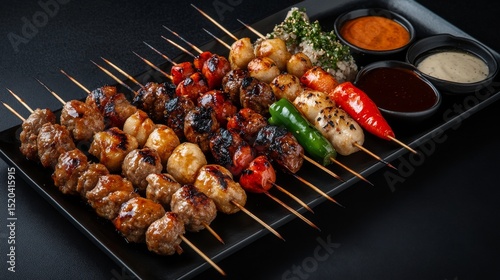 A sleek, high-angle shot of a Japanese izakaya-style table setting, featuring a variety of yakitori skewers, including grilled chicken, tsukune (meatballs), and spicy shishito