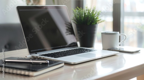 laptop, sleek, desk, clean, natural, light, hot drink, cup, refreshment, notebook, arranged, idea, plant, greenery, balance, work, leisure, remote, productivity, comfortable, inviting, environment, workspace, modern, bright, organised, tidy, home, office, minimalist, professional, relaxing, efficient, inspiration, calm, cosy, functional, neat, stylish, focused, relaxation, creative, atmosphere, blend, elegant, streamlined, motivation