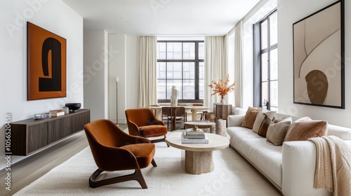 A sleek living room featuring white walls, a terracotta velvet chair, and dark wood decor accents