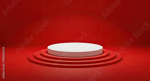 A sleek minimalist design featuring a white circular platform elevated on concentric red rings against a deep red background