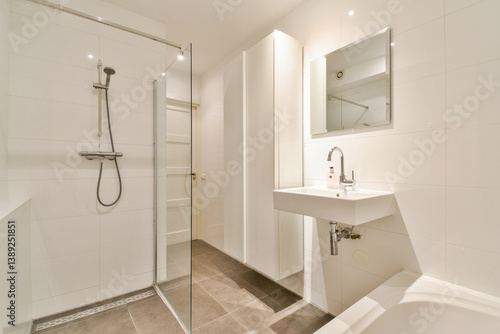 A sleek, modern bathroom featuring a glass shower, minimalist sink, and contemporary fixtures. The clean lines and neutral colors create a serene atmosphere.