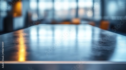 A sleek modern table surface with reflections in a contemporary dining setting.
