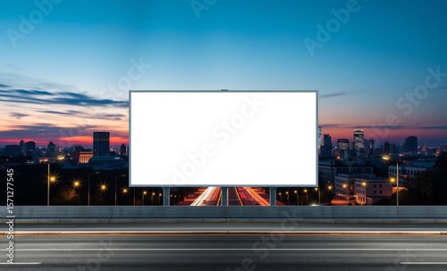 A sleek pristine white billboard framed by a panoramic cityscape stands majestically under a twilight sky its brilliance amplified by the soft glow of streetlights that cascade across the asphalt belo