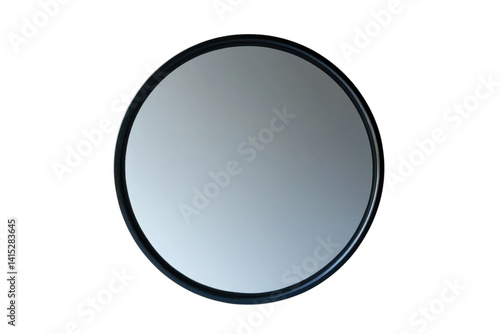 A sleek round mirror with a dark frame reflecting a soft gradient grey hue against a black background Perfect for design elements or on transparent background