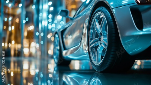A sleek silver car with glossy wheels, reflecting vibrant lights in a modern, illuminated environment.