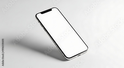A sleek smartphone with a blank white screen on a plain background