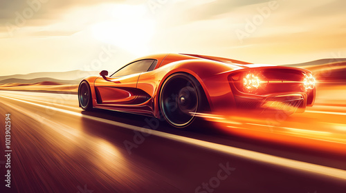 sleek, sport, car, zooming, across, desert, highway, mirage, shimmering, distance, illustration