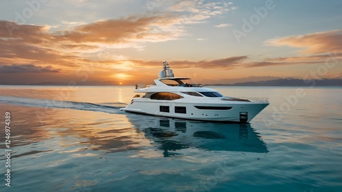 A sleek white yacht floats on a calm turquoise sea, reflecting the golden sunset, with gentle waves lapping against its hull. A lush coastline is visible in the distance