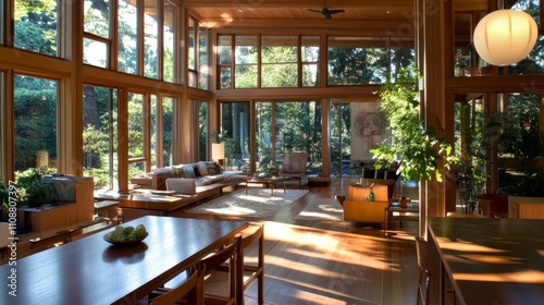 A sleek wooden home interior with a relaxed living zone, dining setup, and a wide panoramic window bringing the outdoors inside