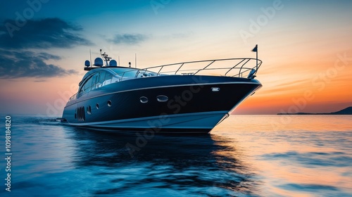A sleek yacht glides through calm waters at sunset, showcasing luxury and leisure.