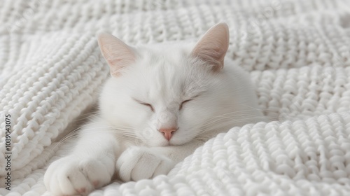 cat, white, sleeping, blanket, fur, cosy, pet, animal, domestic, cute, tranquil, peaceful, rest, paw, whisker, felino, soft, comfy, relaxation, home, warmth, serenity, slumber, adorable, nature, beauty, cuddle, comfort, environment, texture, lazy, indoor, companionship, love, joy, happiness, quiet, stillness, innocence, playful, charming, gentle, fluffy, bedding, lifestyle, calmness