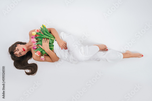 A slender girl presses flowers to her bare chest. Beautiful girl with a bouquet of tulips isolated on white background