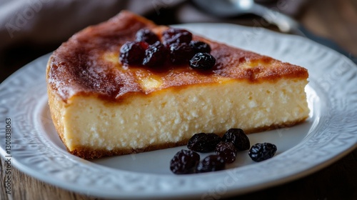 A slice of creamy cheesecake topped with dark berries on an elegant white plate.